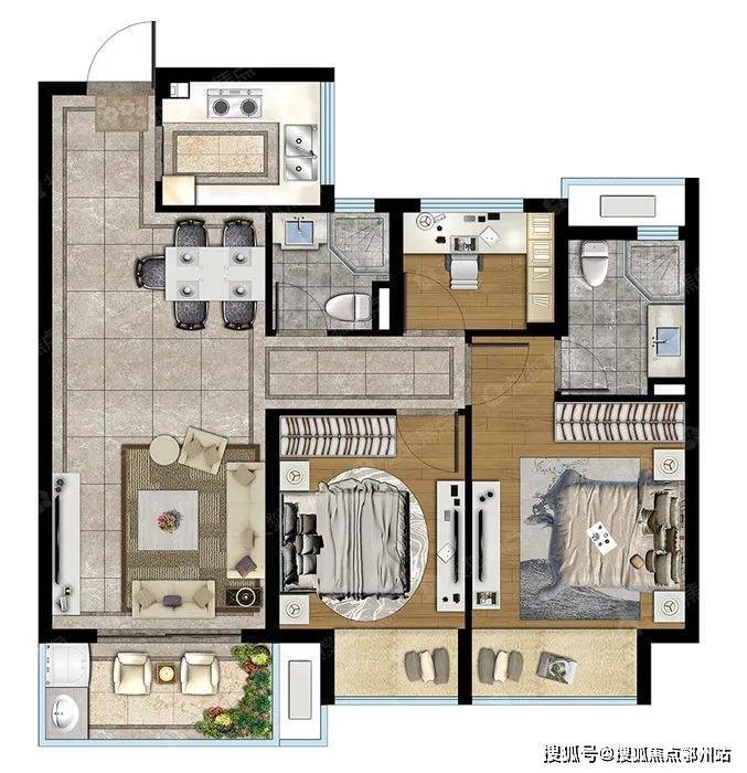 厨房、餐客厅、阳台呈南北一直线走向,清风涌入自然畅通,采光也是一级棒,享受极致阳光。 约 3.3m 长的270°阳台三面采光,视野变大,格局也变大了。