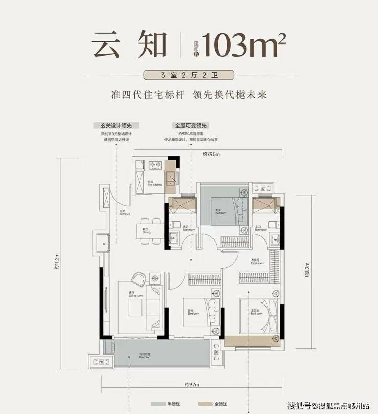 云知户型建面约103平三室两厅两卫:此户型最多,高层两栋楼均有。三开间朝南,功能性最强,可以看出北面的次卧,有着大量的优化面积,不然就只能是个两房加一个书房了。