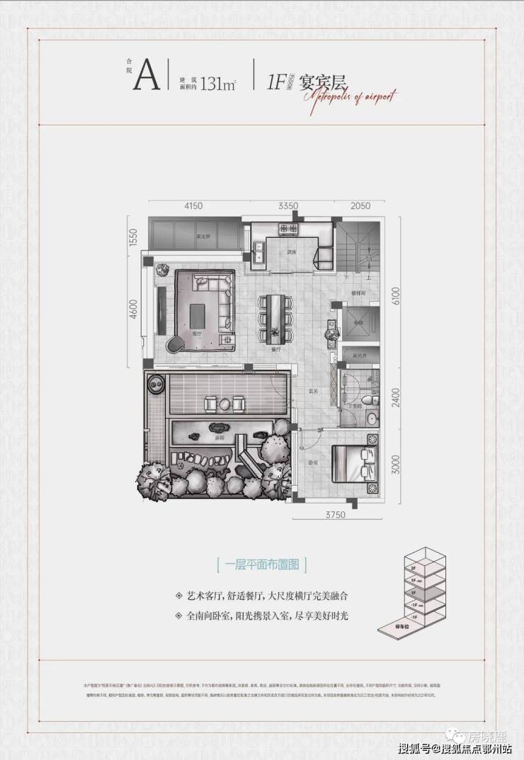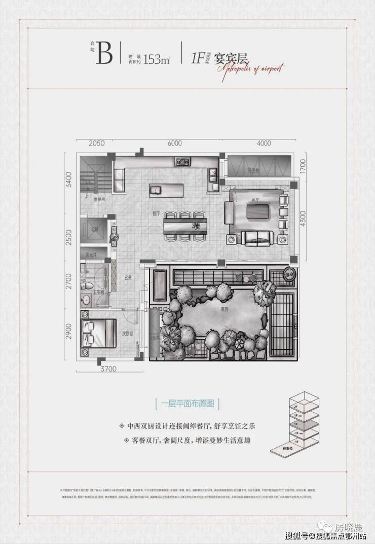 1F“宴宾层”,连接地面庭院,为客/餐厅、厨房所在楼层,另配备一间客卧;
