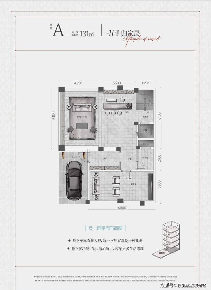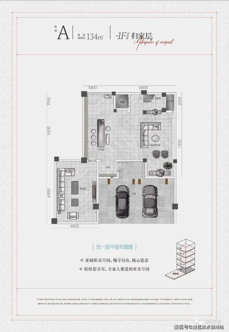 -1F“归家层”实际为地下第2层,为车库(每户2个)、会客厅、棋牌室、影音室(或KTV)、健身室等;