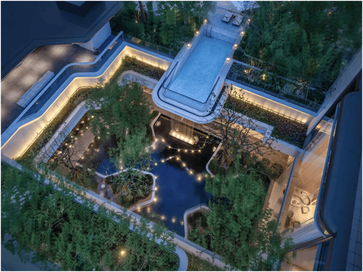 灵感源自新加坡edtion度假酒店的悬挑式戏水池,搭配4.3米飞瀑,创造别具一格的城市绿意的立体浮岛视觉奇观。