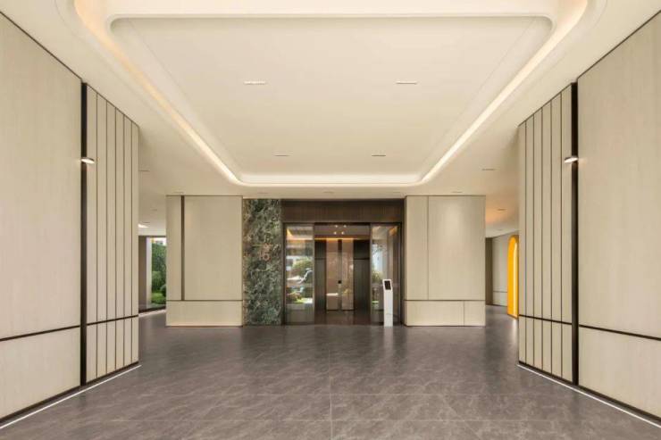 门庭。这里特指单元门庭,通高约4m,气势恢宏。大面积的金属屋檐外挑,彰显贵胄的同时,又扩大遮风挡雨的面积。进门左侧,色彩饱满的普拉达绿竖版镶嵌,美学传达与奢华品质相辅相成。进门后,又是大幅岩板上墙,气质拉满。