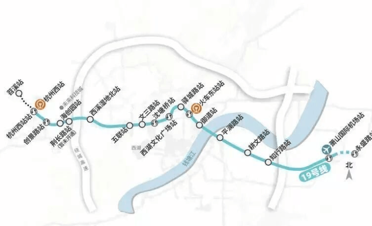 机场快线19号线:直距约870米火车西站站,始于苕溪站,通向萧山机场方向永盛站,从杭州西站到东站仅需30分钟,到萧山机场仅需45分钟。