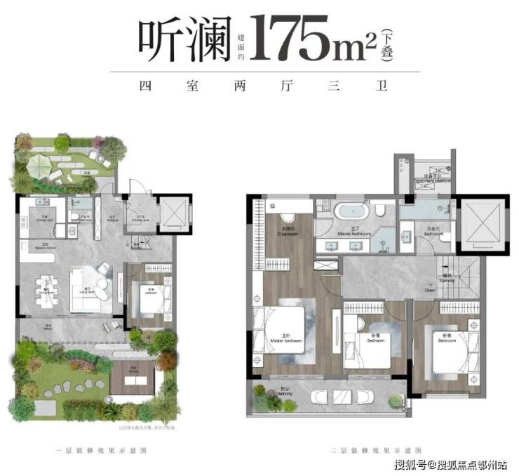 叠墅:有建面约 155㎡和 175㎡两种户型,三开间朝南。其中,175㎡户型配南北双花园,LDKG 一体化巨厅超 40㎡。