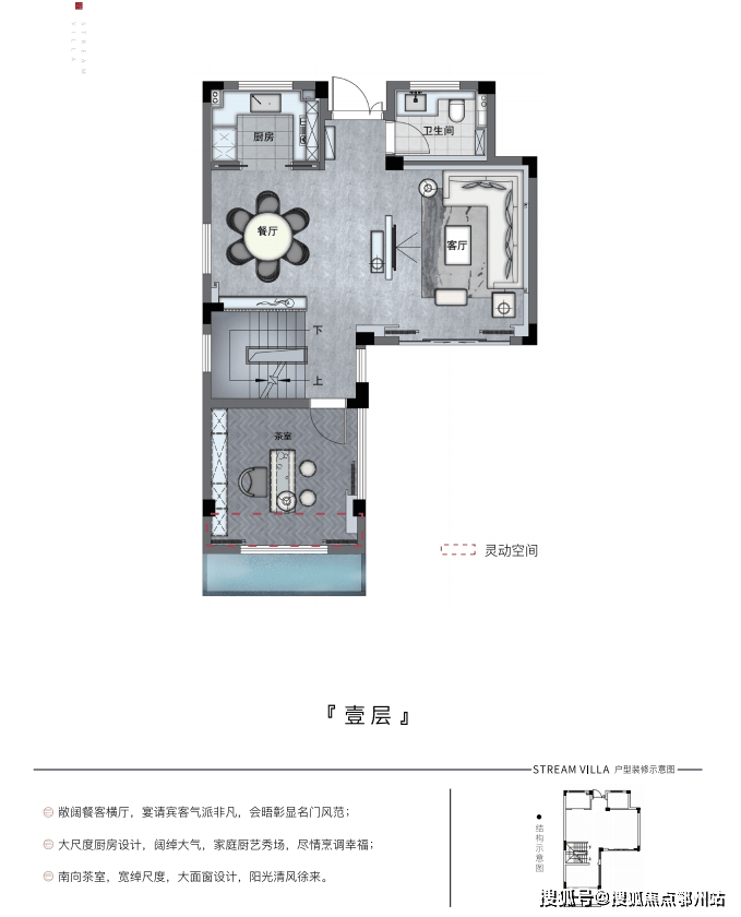 一层约7.8米的大横厅 ,尺度阔绰,场景气派,可以是谈笑风生的会客厅,也可以是亲朋相聚的欢乐园。