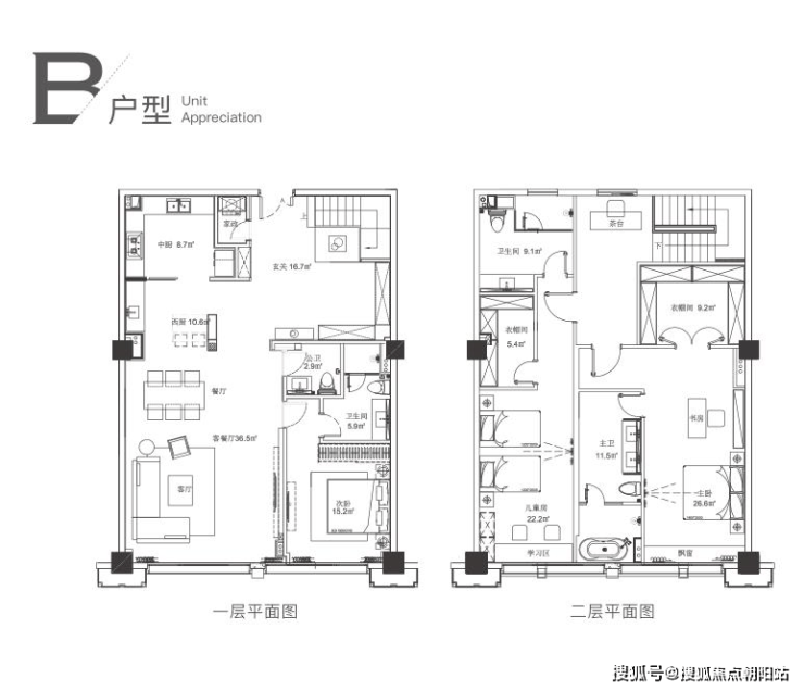 B户型:客餐厅一体,主卧带书房,中西厨,大衣帽间