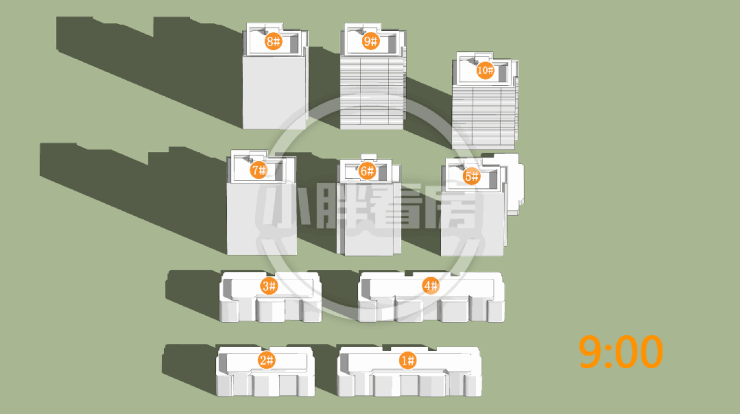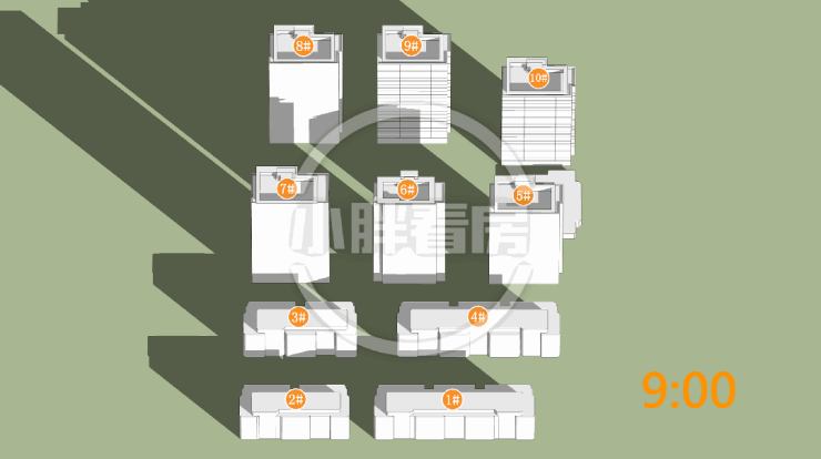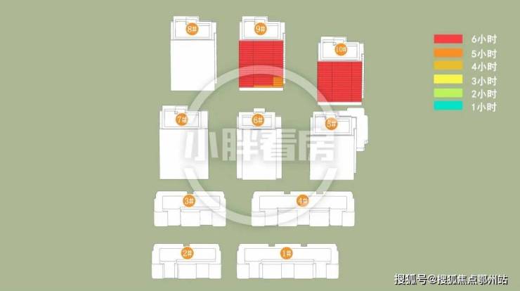 9#10#中低层受遮挡。就具体遮挡时间而言,9#全天不同时段均会受到遮挡。10#主要在中午和下午受5#6#遮挡。