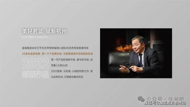 蓝城集团于2010年创立,其前身为绿城建设,2014年正式更名为蓝城中国,董事长宋卫平先生带领原绿城集团核心团队及核心资源组建而成。目前蓝城品牌价值已达316亿,全国项目超500个,蓝城以《美好生活综合服务商》为核心的企业愿景,追求品质生活,造有温度的房子,是蓝城一直追求的理想目标。