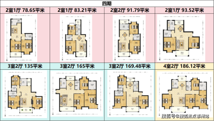 户型方面,区别也不是很大,除了一期有2种1室1厅户型,二-五期都是2室起步,三室到四室不等。多层小高的户型都非常方正,功能空间分布合理,南北通透,采光通风俱佳。还有部分跃层户型。