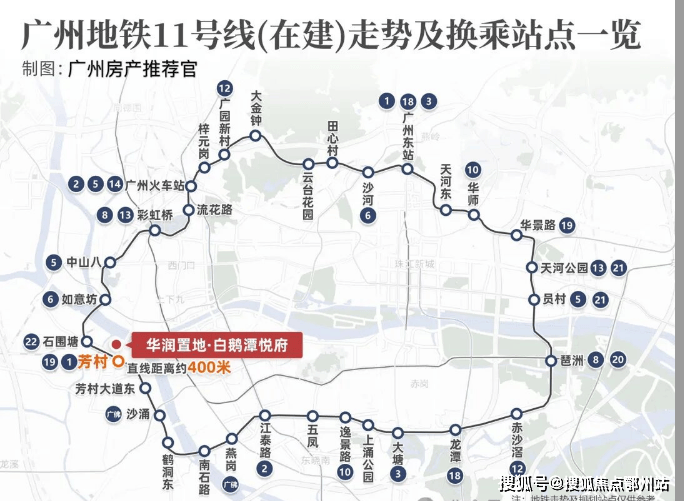 4地铁:约 399 米白鹅潭TOD(芳村站)4 地铁交汇,l 号线已开通,ll 号线/22 号线建设中, 28 号线规划中;