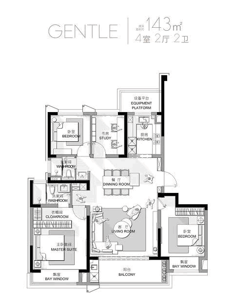 建筑面积约143㎡的4室2厅2卫, 四房疏朗布局, 约5米面宽客厅;双卧朝南,皆配飘窗,邀请阳光于清风入室; 灵动客房设计,为热爱与收纳定制人性化需求。