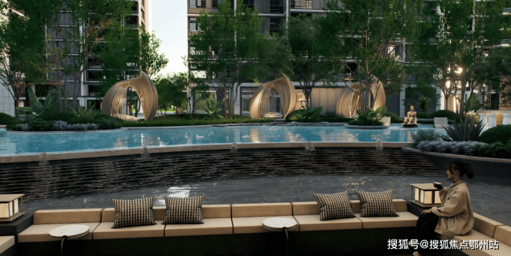 正是 绿城首度落地的3.0泳池综合体。这一空间位于社区核心,归家必经之路上, 融合中心泳池、林下客厅、卡座与廊架,成为串联生活场景的视觉与功能中心。 与立体水院动静相衬,约34米泳池深浅分区,满足孩童嬉戏与成人畅游。池畔 一侧为健身区,一侧为书吧,运动挥汗与静心阅读和谐并存,让身心各得其所。