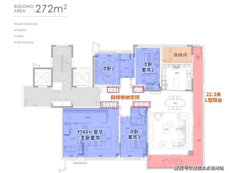 约22.3米L型跑道阳台,约63㎡会客厅,约48㎡主卧豪华套房,还有一个保姆间。