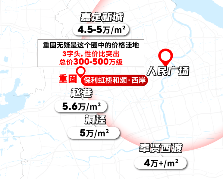 若以市中心为圆心,重固与赵巷、洞泾处于同一半径范围内,但后者房价已达5-5.6万/㎡, 而重固仅3字头