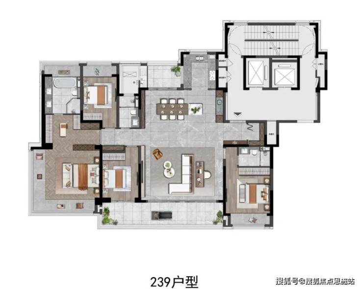 整体户型格局类似239平户型,同样的4房2厅3卫设计,一梯一户,私密性好。
