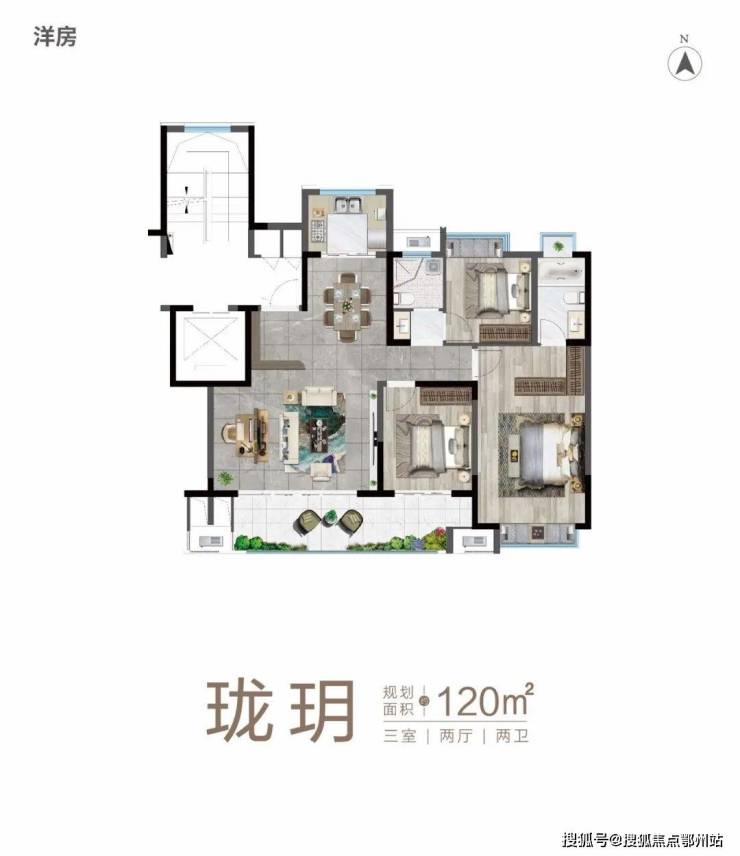 如果说丰富的景观资源是6#楼的核心价值,那么其建筑面积约120㎡的舒居户型,就是打动客户的“杀手锏”。合理的动线布局,阔绰的空间尺度,无不将“舒适”两字演绎的淋漓尽致。