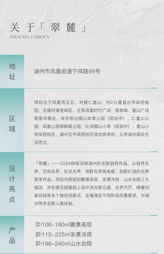 本项目推广名为【绿城·翠麓】,核准地名为【翠麓园】,开发商为湖州经开置业有限公司,代建管理商为浙江绿城佳园建设工程管理有限公司。本资料为要约邀请,不作为要约或承诺,买卖双方权利义务均以《商品房买卖合同》及政府最终审批文件为准。文中涉及到周边环境、交通、商业、教育、医疗等配套的描述,旨在提供相关信息,并不意味着本公司对此做出承诺,具体商业配套及服务内容以相关运营方及政府最新政策为准。本宣传资料发布内容的时间为2024年8月,有效期3个月,敬请留意最新信息。