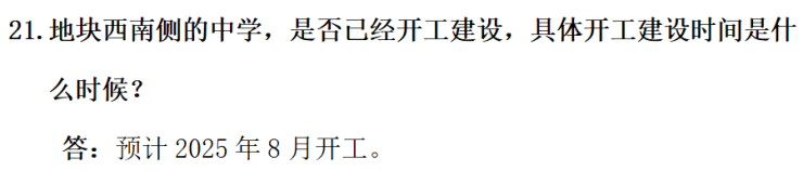 很多人关心目前这里的规划进展如何了?根据该地块的答疑纪要,地块南侧规划小学预计2025年7月开工、2028年4月招生;地块西南侧的中学预计2025年8月开工;地块东侧绿地预计2029年建成!