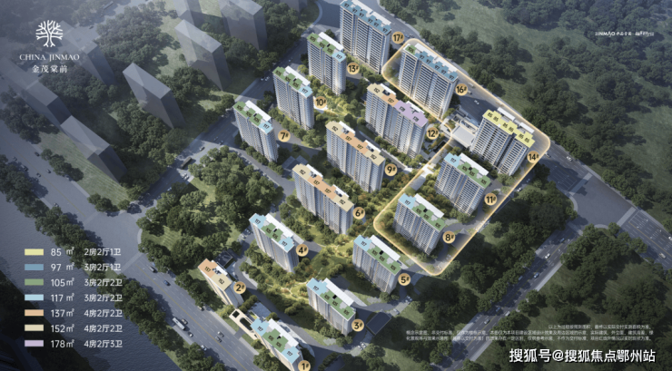 金茂首发地块拟建16-17F小高层,总规划户数约1118户,西南角还规划一处幼儿园, 整体坐北朝南非常工整。(来源于设计过程稿)