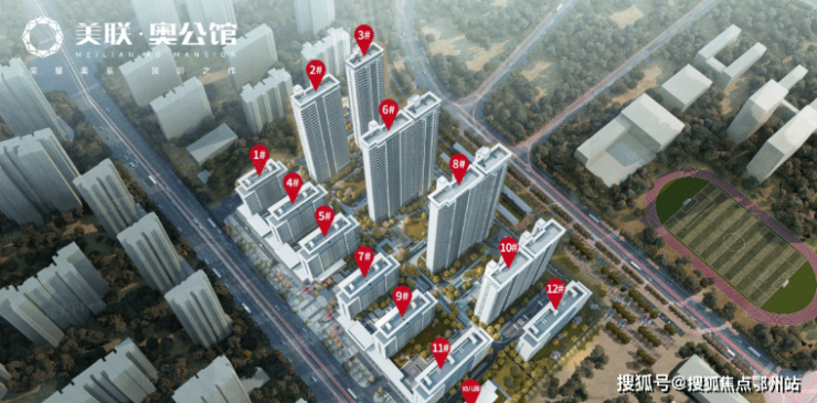 美联奥公馆占地面积约5.3万㎡,总建面约23万㎡,容积率约3,共1318户,车位配比约1:1.45,人车分流设计,包含6栋小高层6栋住宅和1所幼儿园。