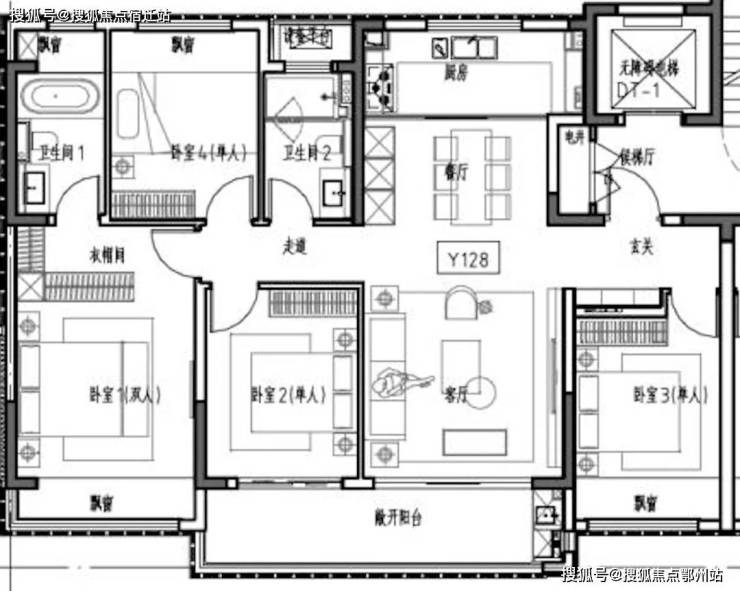 下叠建面约235㎡,4室2厅4卫,三套房设计。这个户型亮点,卧室做了全朝南设计!
