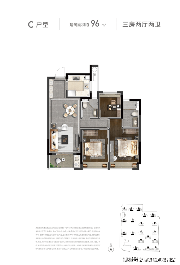 滨旭府总建面约23.5万㎡,由9幢高层(27层)+8幢小高层(18层)+1幢公租房(19号楼)+1幢自持(1号楼)及一所幼儿园组成。小高层主力户型为约89㎡中间套,约98㎡边套,有少量约110㎡边套;高层主力户型为约96㎡中间套,约99㎡边套