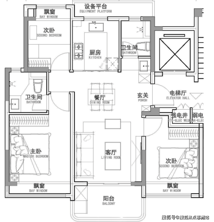 飞机户型格局,客餐厨阳台一线联通, 南北通透,每个房间均有良好的独立性、私密性。
