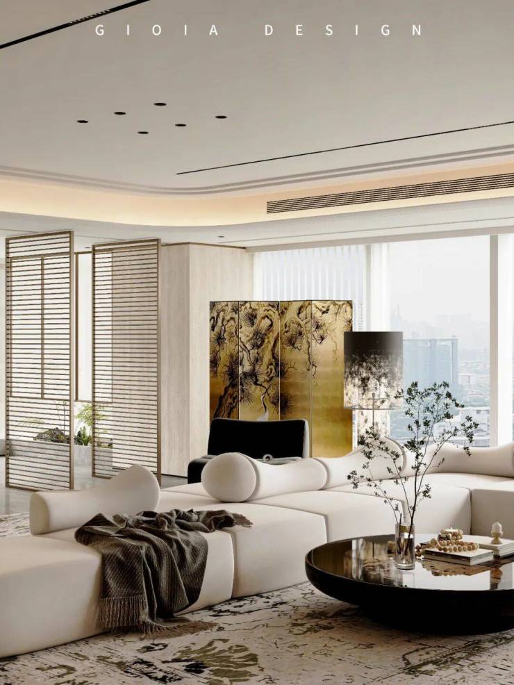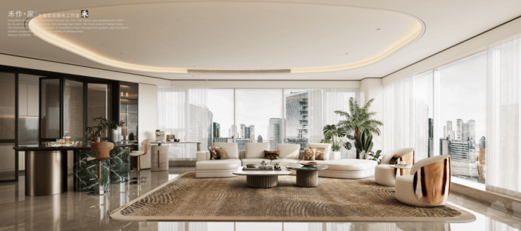 将艺术感进一步融入日常中。特别设计的专属门厅空间,是从电梯厅延伸到家,如同一处艺廊,放慢人的情绪;室内选用了 浅金色奢石(外界也称其为“芬迪白大理石”)作为主要的石材,曲面的木饰面也为浅色,整体给人以明亮感。