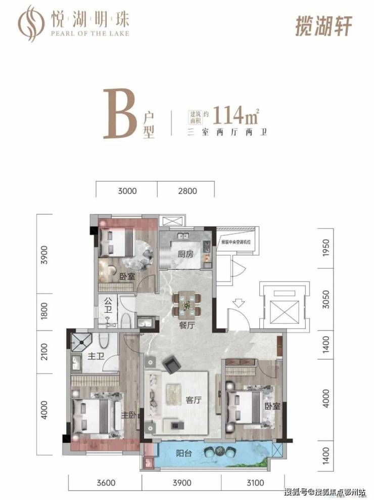 建面约114㎡一线瞰湖洋房,3房2厅2卫设计,