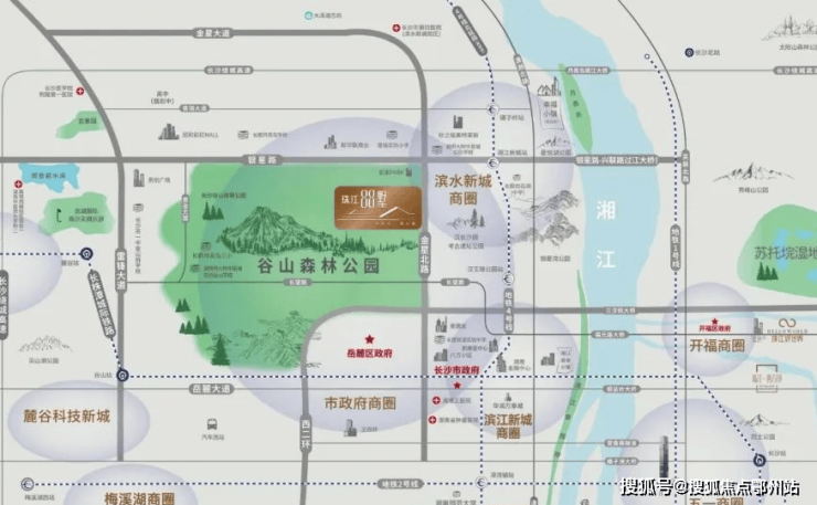 交通:毗邻城市主轴金星大道,直线距离约1km地铁4号线湘江新城站,毗邻长株潭城际轻轨、高铁西站,畅达全城开启无界生活。(数据来源:百度地图直线测绘)