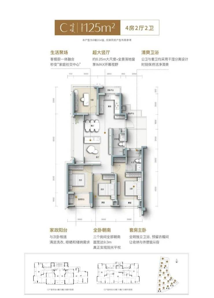 建面约139㎡南向四开间,引阳光肆意倾洒, LDK一体化宽厅,打破空间隔阂, 成为家人互动、朋友欢聚的核心场域, 餐厨开放式设计,让烹饪不再孤单,自定义X空间,实现“不为人生设限”,次卧家政阳台,兼顾实用与观景,约3.6米奢阔主卧,妥帖安放身心,精细化收纳,生活井然有序......