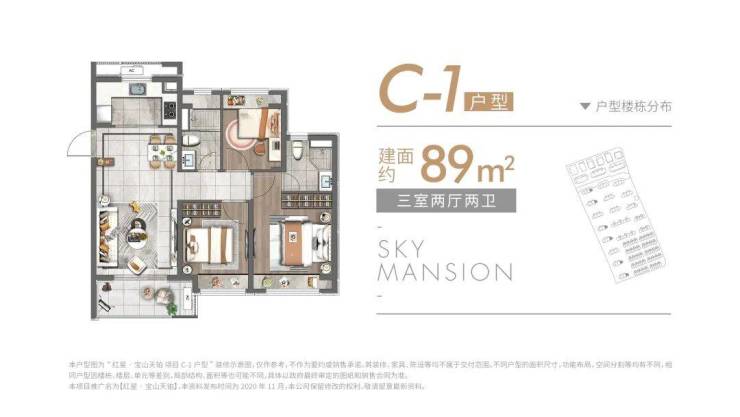 9-10层洋房: 建面约89㎡(三房两厅两卫)