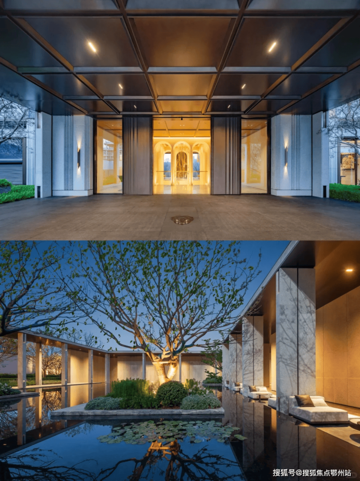 大门以非遗杭扇为灵感,偏中式,穿过门庭就是公区水院和会客厅。