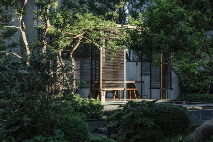 厅堂和轩堂,也在这番赏景过程中,如画卷般依次展开。前者还原出孔子树下讲学的场景,后者则用金属编织的卷帘搭配青绿色彩釉玻璃,构建出一个品茗厅琴的空间。这一切来得如此自然、连贯,富有节奏和层次,把园林艺术的本质抓得入木三分。