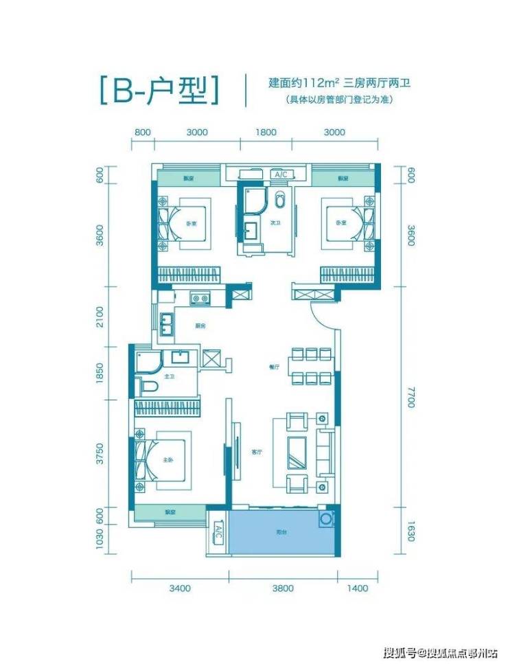 比如以建面约112㎡的户型为例,做到了三房两厅的格局,户型全明通透,三大飘窗+南向景观阳台+双卫浴的配置。从人居动线的布局、空间的奢阔感、居住的舒适度、功能的完整性、不同家庭结构生活需求等多方面进行考量,最大限度不浪费任何面积。