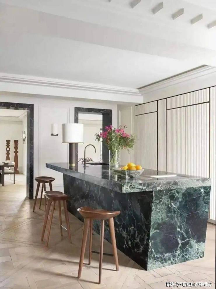 餐客厅尺度达到了惊人的 16米,97m²,用一席壁炉做了视线分离,米色的洞石、自然冰裂纹的艺术漆。背景墙拱形胡桃木的静谧,地板拼花木格纹的精细,沙发钢琴键织布的韵律,营造的是回归生活本质的轻松写意。