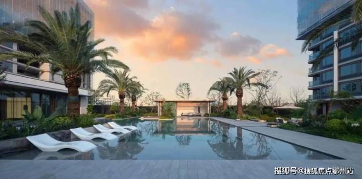 约2000㎡镜面摩登水院热带泳池,搭配加拿利海枣树阵、风雨连廊,让你下楼就能享受巴厘岛式的度假体验。