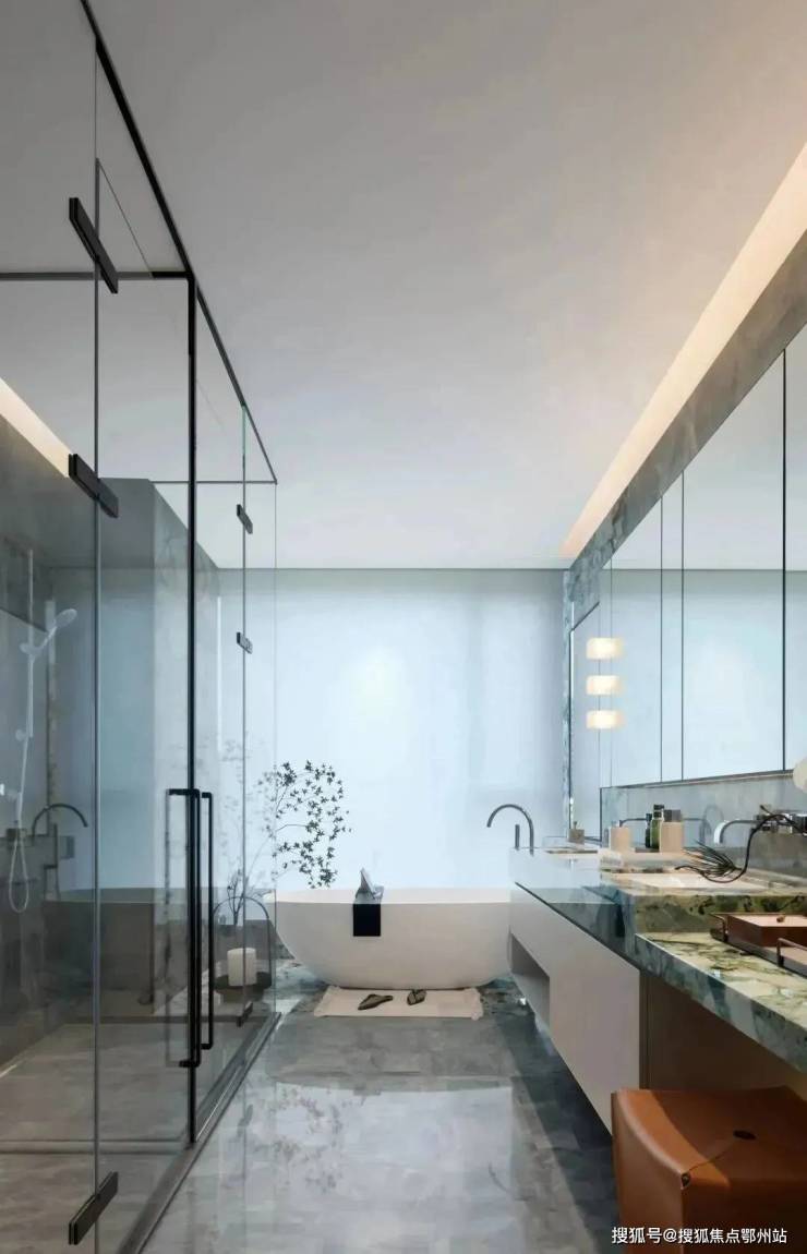 穿过一小段走廊,到主人的休憩区,先是舒怡的衣帽间,朦胧柜饰面,让休整充满优雅从容。卫生间以星雅灰大理石覆面,独立浴缸旁则用冷翡翠奢石点缀,一侧更设有整面玻璃,通透明亮。若沐浴间小酌,望见城市界面,于雅居,见繁华。