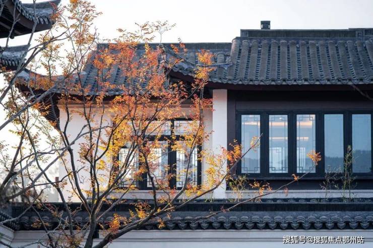 整体色调以青瓦、木色、仿石高级灰,映衬素雅白墙;游廊、飞檐、挂落、硬山顶、攒尖等经典宋代建筑元素贯穿园区,眼角眉梢,俱是风情。