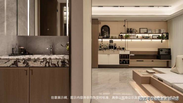 细节上,餐厅飘窗上的柜子是交付的;岛台靠餐客厅一侧也做了开放式的收纳,配了升降插座;