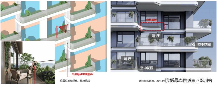 如解决上下楼空中花园可能存在的私密性问题:项目采用增高磨砂玻璃挡板的设计,以及通过精细化布局植物高度、种类和密度等方式进行视野阻断,确保私密性;