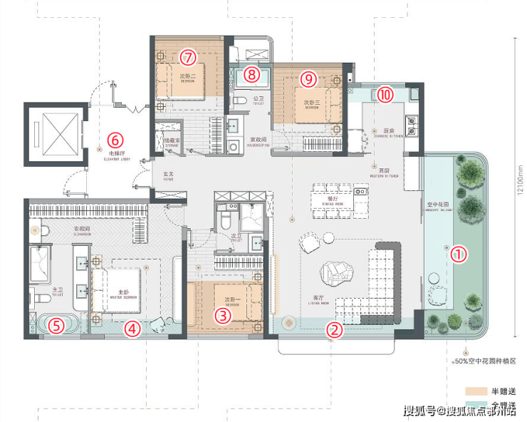④极致得房率:约16-22平双层挑空花园、约7.4-9.3平电梯前室、多个阳台及飘窗,可优化空间相当丰富,加上本身较低的合同公摊,优化后实得面积超级震撼。