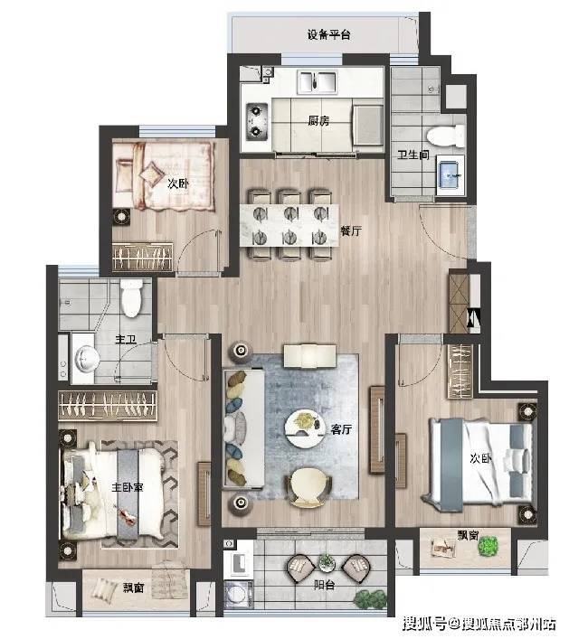 主卧套房,次卧带阳台,全明双卫。