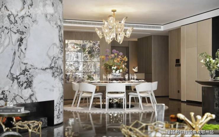 东区建面约320户型,将艺术感进一步融入日常中。特别设计的专属门厅空间,是从电梯厅延伸到家,如同一处艺廊,放慢人的情绪;室内选用了浅金色奢石(外界也称其为“芬迪白大理石”)作为主要的石材,曲面的木饰面也为浅色,整体给人以明亮感。