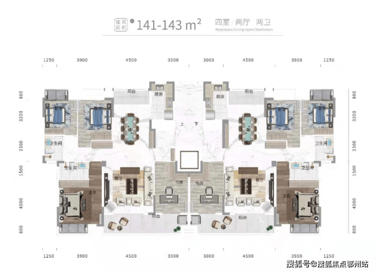 平层最小面积为建面 约141㎡/143㎡四室两厅两卫大洋房户型,私家电梯入户,南向超阔阳台,约8米奢阔横厅,宽敞气派。