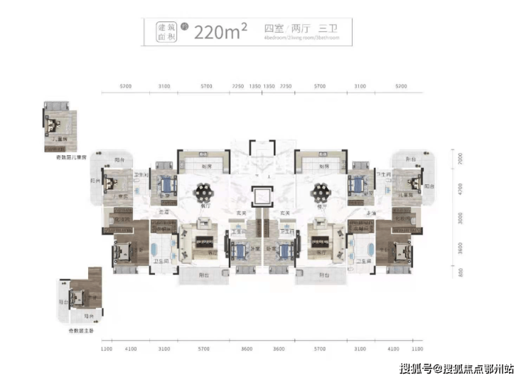 平层还有 建面约213㎡/225㎡三室三厅三卫约185㎡/220㎡四室两厅三卫,皆为豪宅尺度。