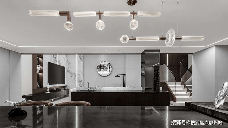 以及对空间节奏的把控!沿梯下行楼梯利用灯光,呈现出轻盈的悬浮感,夹层作为阅读空间延续了整体色调,在黑白之中求得平衡 不张扬 也不喧闹,弧形沙发和圆形茶几带来的包围感!