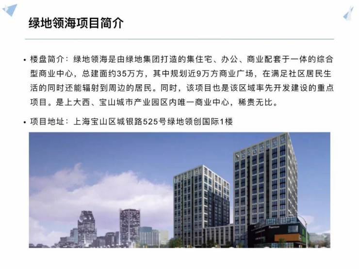 绿地领海是一个总建筑面积约35万平方米的大型综合社区,由品牌开发商绿地集团开发建设。集住宅、办公、商业配套于一体,其中社区规划有近9万平方米的商业广场,在满足社区居民生活的同时还能辐射到周边的居民。