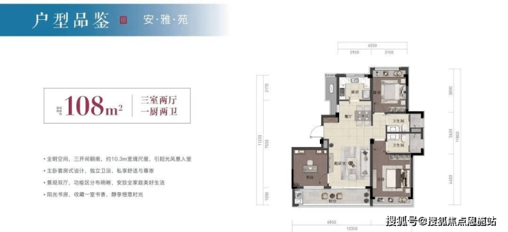 全明空间,三开间朝南,约10.3m宽境尺度,引阳光风景入室;主卧套房式设计,独立卫浴,私享舒适与尊崇。