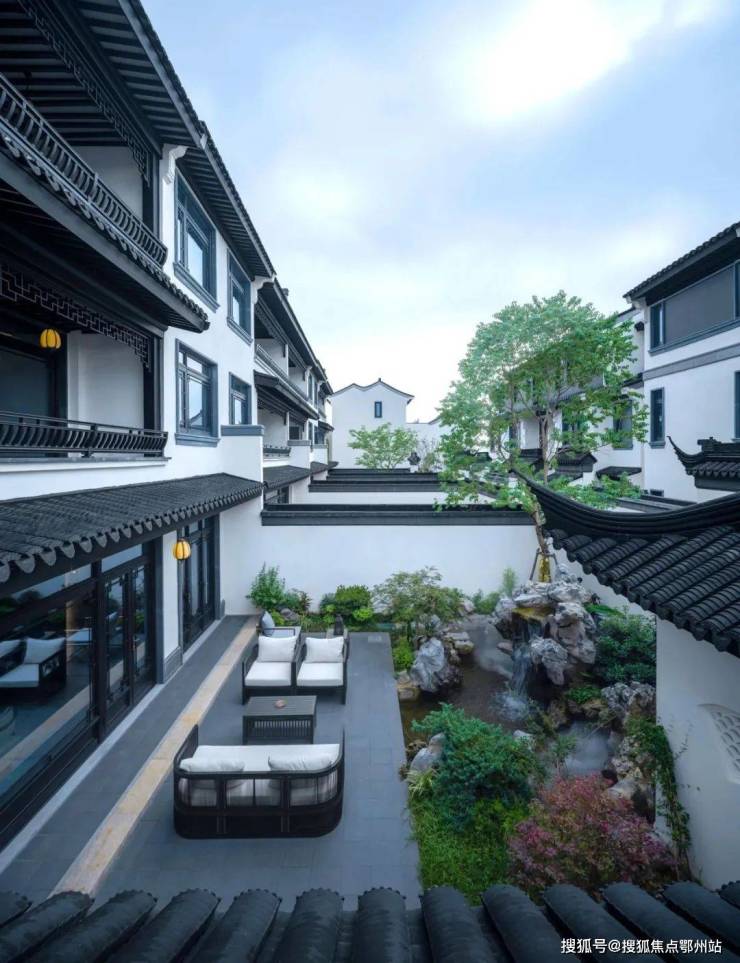 打造移步换景的江南园林雅境, 呈现“堂、巷、院、宅”四进式礼序院落。,将千年东方礼序融于一院。结合框景、对景、漏景等丰富的造景设计,营造“移步换景、如在画中”之感,汇集杭州桃李春风、安吉天使小镇等蓝城经典中式合院营造经验之大成,专为当代名人雅士打造有天有地有花园的江南院落生活。